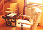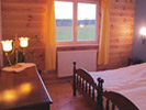 Im Obergeschoß gibt es zwei weitere Duschbäder, ein Schlafzimmer mit „Himmelbett“ und ein weiteres mit drei Einzelbetten. Außerdem lädt dort zweites ein Kaminzimmer mit kleiner Bibliothek und separatem Fernseher (mit DVD-Player) zum Verweilen ein.